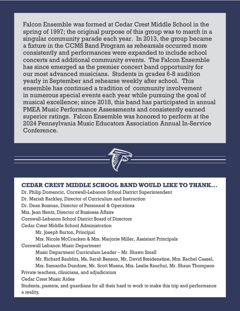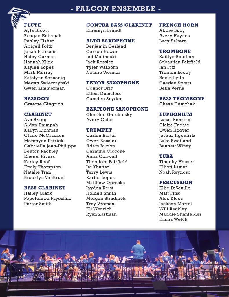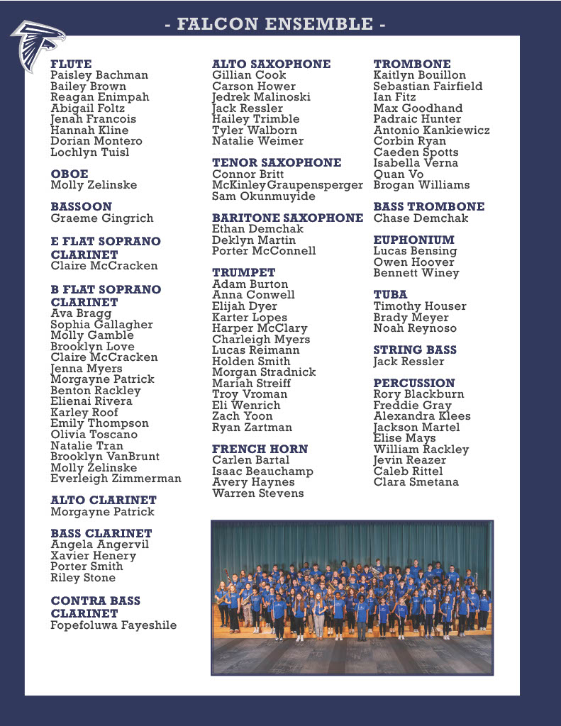The Falcon Ensemble is comprised of students in grades 6 through 8 and meets one day per week after school. The Falcon Ensemble focuses on developing advanced musicianship through a more demanding repertoire. In addition to performing at the 7th/8th Grade Band concert, the Falcon Ensemble also frequently performs in the community, giving students the opportunity to perform for varied audiences.