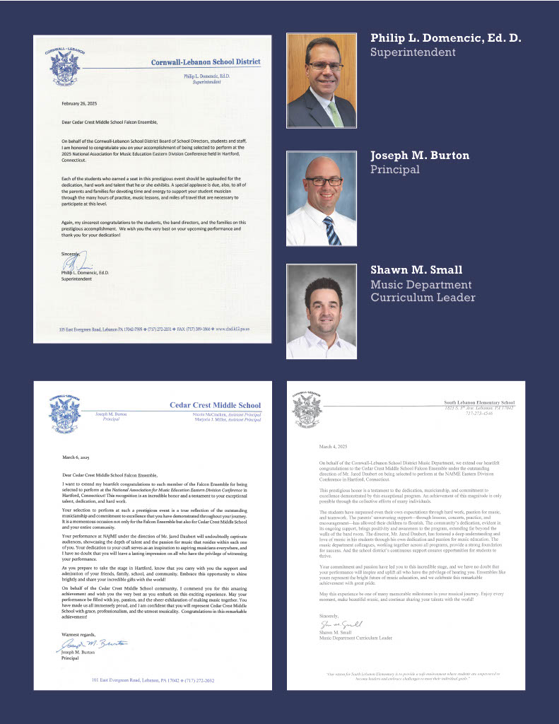 Falcon Ensemble is a high-achieving ensemble. The group frequently earns superior ratings at Pennsylvania Music Educators Association Music Performance Assessments. Falcon Ensemble had the honor of being selected to perform at the 2024 Pennsylvania Music Educators Association Annual In-Service Conference, the 2025 National Association for Music Education Eastern Division Conference, and the 2026 Philadelphia Wind Band Festival (Music for All Affiliate Regional Music Festival) at West Chester University.