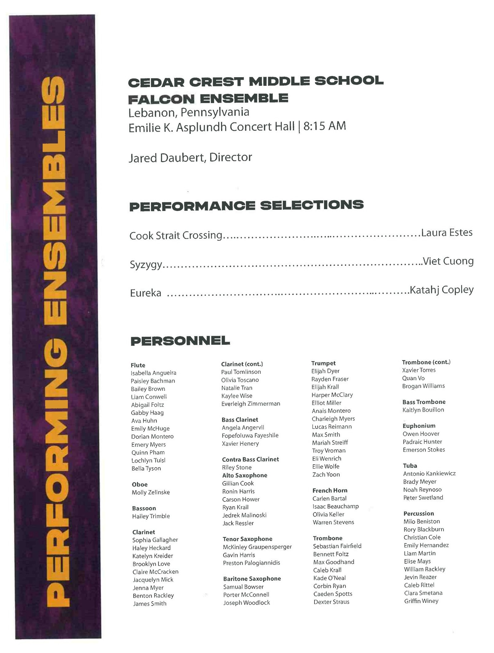 - Students will perform excerpts from selected repertoire to audition for this ensemble; see Mr. Daubert for audition materials.